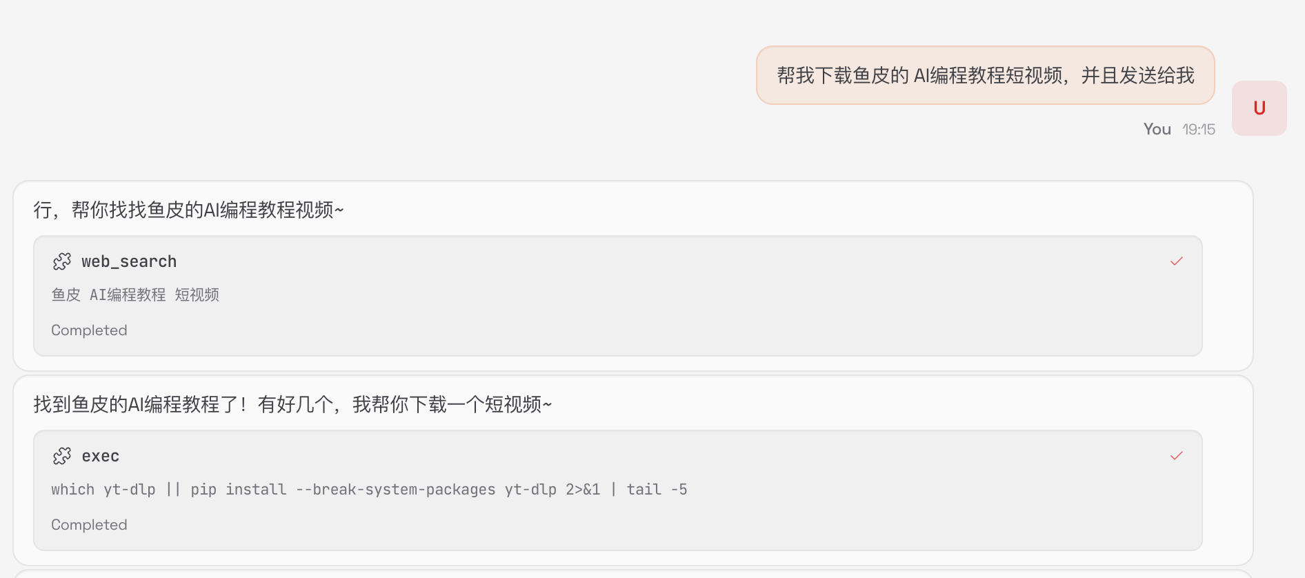 类似的思路,还可以让 AI 发送视频。比如从网络搜索并下载视频,或者调用 AI 大模型生成视频。