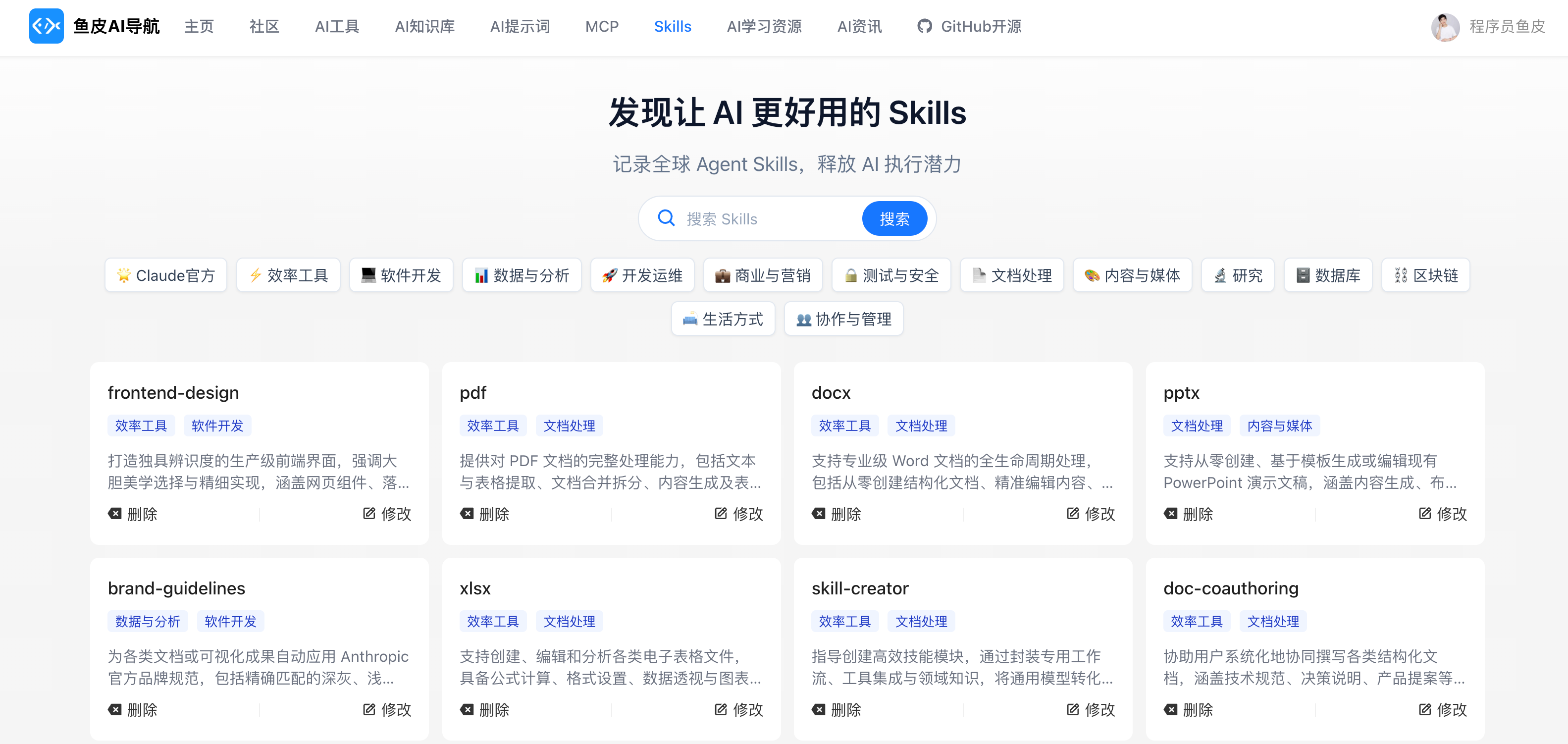 鱼皮 AI 导航 - Skills 专区:我的中文 Agent Skills 导航网站,按分类整理好了几百个 Skills,界面友好、查找方便,适合国内的朋友们使用。