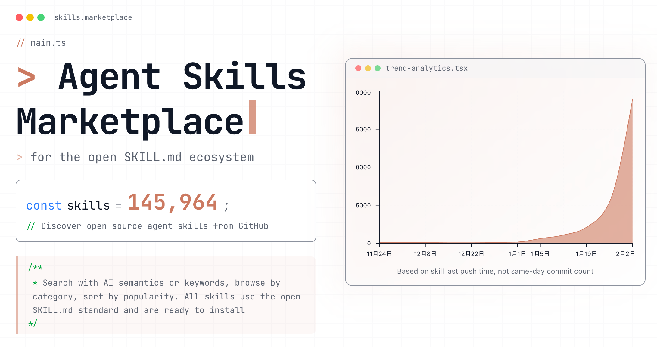skills.sh:Vercel 官方出品的 Skills 排行榜,能看到每个 Skill 的安装量、使用趋势,还支持一键安装。想知道哪些 Skills 最火,来这里看就对了。
