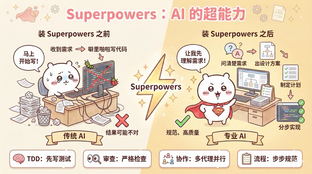 装了它之后,AI 不会直接开始写代码,而是会先问清楚需求、出设计方案让你确认、制定详细执行计划,最后才分步骤实现。适合开发大型项目、需要高质量代码的场景。