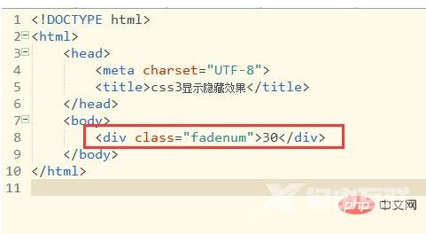 在html代码页面创建一个<div>标签,然后给这个<div>添加一个class类并设置一些文字,用于显示淡出淡入动画效果(那里中使用的类名:fadenum,下面将直接对该类进行描述)。如图: