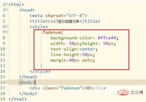 设置<div>类样式。创建<style>标签,在这个标签里面设置fadenum类的宽、高、背景色,方便接下来查看淡出淡入效果。如图: