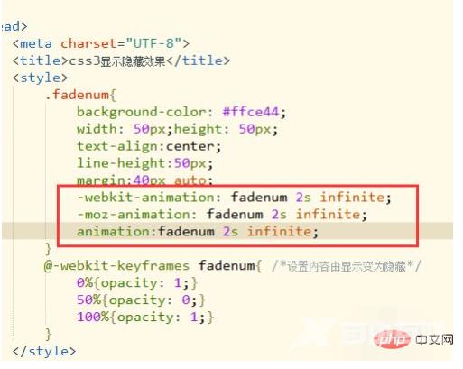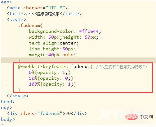 <!DOCTYPE html><html><head><meta charset="UTF-8"><title>css3显示隐藏效果</title><style>.fadenum{background-color: #ffce44;width: 50px;height: 50px;text-align:center;line-height:50px;margin:40px auto;-webkit-animation: fadenum 2s infinite; -moz-animation: fadenum 2s infinite; animation:fadenum 2s infinite;}@-webkit-keyframes fadenum{ /*设置内容由显示变为隐藏*/ 0%{opacity: 1;} 50%{opacity: 0;} 100%{opacity: 1;}}@-moz-keyframes fadenum{ /*设置内容由显示变为隐藏*/ 0%{opacity: 1;} 50%{opacity: 0;} 100%{opacity: 1;}}@-o-keyframes fadenum{ /*设置内容由显示变为隐藏*/ 0%{opacity: 1;} 50%{opacity: 0;} 100%{opacity: 1;}}@keyframes fadenum{ /*设置内容由显示变为隐藏*/ 0%{opacity: 1;} 50%{opacity: 0;} 100%{opacity: 1;}}</style></head><body><div class="fadenum">30</div></body></html>注意事项