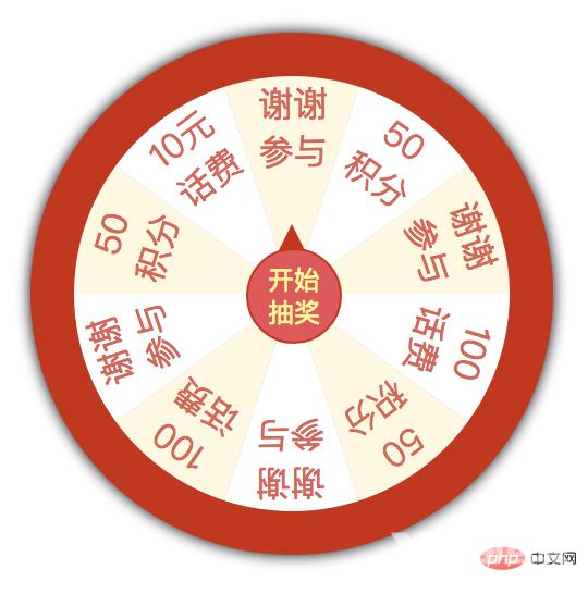 <!DOCTYPE html><html><head> <meta charset="UTF-8"> <title>幸运大转盘</title> <style> /* 重置默认样式 */ * { margin: 0; padding: 0; border: none; outline: none; } .wrapper { position: relative; height: 200px; width: 200px; padding: 20px; margin: 20px; background-color: #c0381f; box-shadow: #000000 0px 0px 10px; border-radius: 50%; } .panel { position: relative; height: 200px; width: 200px; background-color: #b7b7b7; border-radius: 100px; } .sector { position: absolute; width: 100px; height: 200px; border-radius: 0px 100px 100px 0; overflow: hidden; left: 100px; top: 0px; transform-origin: left center; } .sector:nth-child(1) { transform: rotate(-18deg); } .sector:nth-child(2) { transform: rotate(18deg); } .sector:nth-child(3) { transform: rotate(54deg); } .sector:nth-child(4) { transform: rotate(90deg); } .sector:nth-child(5) { transform: rotate(126deg); } .sector:nth-child(6) { transform: rotate(162deg); } .sector:nth-child(7) { transform: rotate(198deg); } .sector:nth-child(8) { transform: rotate(234deg); } .sector:nth-child(9) { transform: rotate(270deg); } .sector:nth-child(10) { transform: rotate(306deg); } .sector:nth-child(2n+1) .sector-inner { background: #fef6e0; } .sector:nth-child(2n) .sector-inner { background: #ffffff; } .sector-inner { text-align: center; display: block; width: 40px; padding: 5px 3px 0 57px; height: 195px; transform: translateX(-100px) rotate(36deg); transform-origin: right center; border-radius: 100px 0 0 100px; } .sector-inner span { display: block; transform-origin: center; transform: rotate(-19deg); color: #d46854; } .pointer { position: absolute; left: 79px; top: 79px; z-index: 10; height: 30px; width: 30px; padding: 6px; color: #fff899; line-height: 15px; font-size: 12px; text-align: center; background-color: #dc5b5b; border-radius: 50%; border: 1px solid #c0381f; } .pointer::after { content: ''; position: absolute; left: 14px; top: -24px; border-width: 12px 6px; border-style: solid; border-color: transparent; border-bottom-color: #c0381f; } </style></head><body> <div> <div> <div> <div> <span>谢谢参与</span> </div> </div> <div> <div> <span> 50 积分</span> </div> </div> <div> <div> <span>谢谢参与</span> </div> </div> <div> <div> <span>100话费</span> </div> </div> <div> <div> <span> 50 积分</span> </div> </div> <div> <div> <span>谢谢参与</span> </div> </div> <div> <div> <span>100话费</span> </div> </div> <div> <div> <span>谢谢参与</span> </div> </div> <div> <div> <span> 50 积分</span> </div> </div> <div> <div> <span>10元话费</span> </div> </div> <div>开始抽奖</div> </div> </div></body></html>