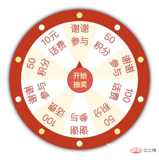 <!DOCTYPE html><html><head> <meta charset="UTF-8"> <title>幸运大转盘</title> <style> /* 重置默认样式 */ * { margin: 0; padding: 0; border: none; outline: none; } .wrapper { position: relative; height: 200px; width: 200px; padding: 20px; margin: 20px; background-color: #c0381f; box-shadow: #000000 0px 0px 10px; border-radius: 50%; } .light { position: absolute; height: 10px; width: 10px; border-radius: 50%; top: 5px; left: 115px; transform-origin: 5px 115px; } .light:nth-child(2n) { background-color: #fafce7; } .light:nth-child(2n+1) { background-color: #ffe58b; } .light:nth-child(2) { transform: rotate(36deg); } .light:nth-child(3) { transform: rotate(72deg); } .light:nth-child(4) { transform: rotate(108deg); } .light:nth-child(5) { transform: rotate(144deg); } .light:nth-child(6) { transform: rotate(180deg); } .light:nth-child(7) { transform: rotate(216deg); } .light:nth-child(8) { transform: rotate(252deg); } .light:nth-child(9) { transform: rotate(288deg); } .light:nth-child(10) { transform: rotate(324deg); } .panel { position: relative; height: 200px; width: 200px; background-color: #b7b7b7; border-radius: 100px; } .sector { position: absolute; width: 100px; height: 200px; border-radius: 0px 100px 100px 0; overflow: hidden; left: 100px; top: 0px; transform-origin: left center; } .sector:nth-child(1) { transform: rotate(-18deg); } .sector:nth-child(2) { transform: rotate(18deg); } .sector:nth-child(3) { transform: rotate(54deg); } .sector:nth-child(4) { transform: rotate(90deg); } .sector:nth-child(5) { transform: rotate(126deg); } .sector:nth-child(6) { transform: rotate(162deg); } .sector:nth-child(7) { transform: rotate(198deg); } .sector:nth-child(8) { transform: rotate(234deg); } .sector:nth-child(9) { transform: rotate(270deg); } .sector:nth-child(10) { transform: rotate(306deg); } .sector:nth-child(2n+1) .sector-inner { background: #fef6e0; } .sector:nth-child(2n) .sector-inner { background: #ffffff; } .sector-inner { text-align: center; display: block; width: 40px; padding: 5px 3px 0 57px; height: 195px; transform: translateX(-100px) rotate(36deg); transform-origin: right center; border-radius: 100px 0 0 100px; } .sector-inner span { display: block; transform-origin: center; transform: rotate(-19deg); color: #d46854; } .pointer { position: absolute; left: 79px; top: 79px; z-index: 10; height: 30px; width: 30px; padding: 6px; color: #fff899; line-height: 15px; font-size: 12px; text-align: center; background-color: #dc5b5b; border-radius: 50%; border: 1px solid #c0381f; } .pointer::after { content: ''; position: absolute; left: 14px; top: -24px; border-width: 12px 6px; border-style: solid; border-color: transparent; border-bottom-color: #c0381f; } </style></head><body> <div> <div></div> <div></div> <div></div> <div></div> <div></div> <div></div> <div></div> <div></div> <div></div> <div></div> <div> <div> <div> <span>谢谢参与</span> </div> </div> <div> <div> <span> 50 积分</span> </div> </div> <div> <div> <span>谢谢参与</span> </div> </div> <div> <div> <span>100话费</span> </div> </div> <div> <div> <span> 50 积分</span> </div> </div> <div> <div> <span>谢谢参与</span> </div> </div> <div> <div> <span>100话费</span> </div> </div> <div> <div> <span>谢谢参与</span> </div> </div> <div> <div> <span> 50 积分</span> </div> </div> <div> <div> <span>10元话费</span> </div> </div> <div>开始抽奖</div> </div> </div></body></html>