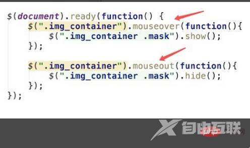5.然后,添加mouseover和mouseout事件,主要是当鼠标移到图像容器时显示遮罩层,并在鼠标移出时隐藏遮罩层。