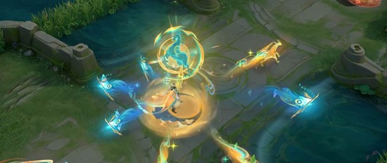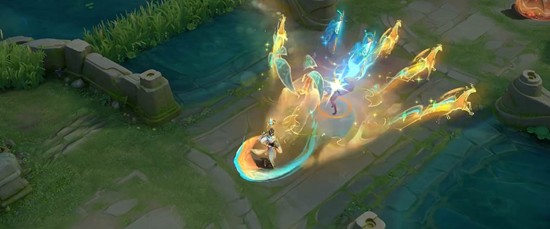 普通攻击掷出神骥符节,命中时激起沙砾漩涡。被动强化普攻随机触发两种形态,或是以符节度关山,或是以驼铃引路大漠,再现丝路景象。