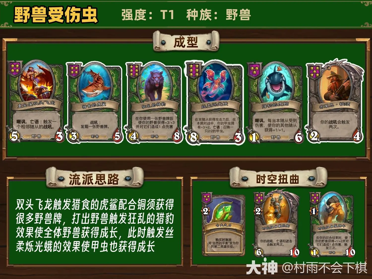 双头飞龙触发猎食的虎鲨配合铜须获得很多野兽牌,打出野兽触发狂乱的猎豹效果使全体野兽获得成长,此时触发丝柔烁光蛾的效果使甲虫也获得成长