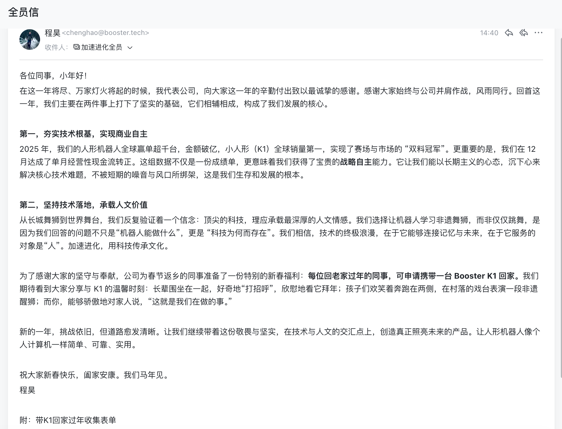 在技术落地与人文融合上,公司以机器人演绎非遗醒狮,从长城走向全球舞台,践行「科技传承文化」的理念,探索技术与人的价值连接。值得注意的是,为回馈员工,加速进化推出专属新春福利:春节返乡员工可申请携带 Booster K1 回家,让科技成果走进家庭。
