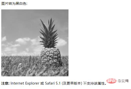 <!DOCTYPE html><html><head><style>img { -webkit-filter: grayscale(100%); /* Chrome, Safari, Opera */ filter: grayscale(100%);}</style></head><body><p>图片转为黑白色:</p><img src="pineapple.jpg" alt="Pineapple" width="300" height="300"><p><strong>注意:</strong> Internet Explorer 或 Safari 5.1 (及更早版本) 不支持该属性。</p></body></html>运行结果: