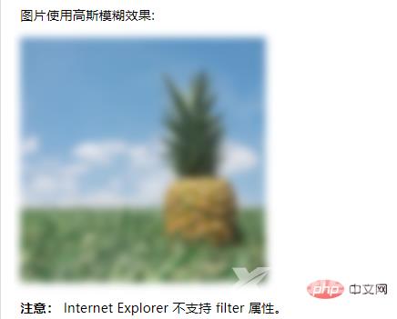 <!DOCTYPE html><html><head><style>img { -webkit-filter: blur(5px); /* Chrome, Safari, Opera */ filter: blur(5px);}</style></head><body><p>图片使用高斯模糊效果:</p><img src="pineapple.jpg" alt="Pineapple" width="300" height="300"><p><strong>注意:</strong> Internet Explorer 不支持 filter 属性。</p></body></html>运行结果: