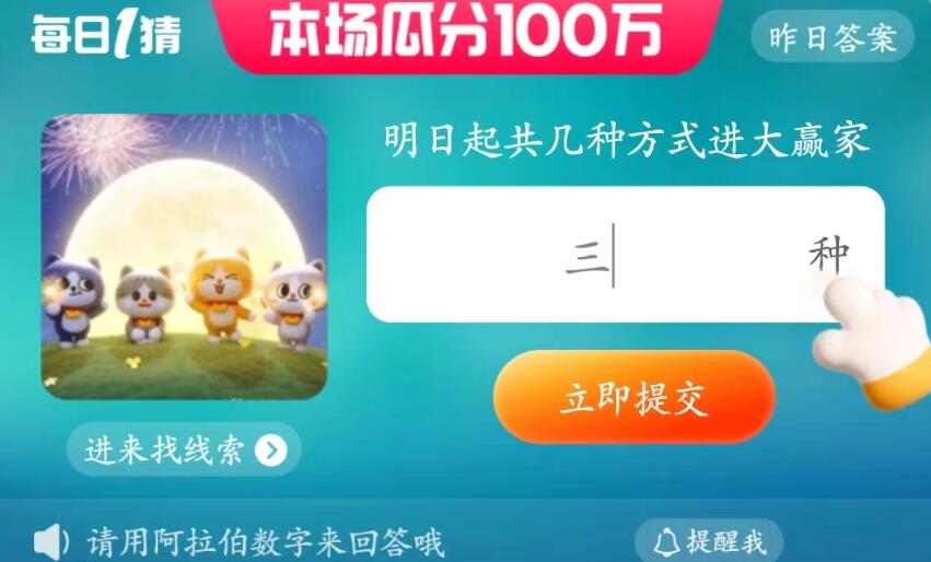 明日起共几种方式进大赢家?淘宝大赢家每日一猜6月26日的最新问题当中玩家需要找到明日起共几种方式进大赢家的答案,答对就能够获得奖励,那么每日一猜6月26日的答案是什么呢?今天为玩家们带来的是6月26日的问题及答案,还不了解的小伙伴可以来到这里看一看。