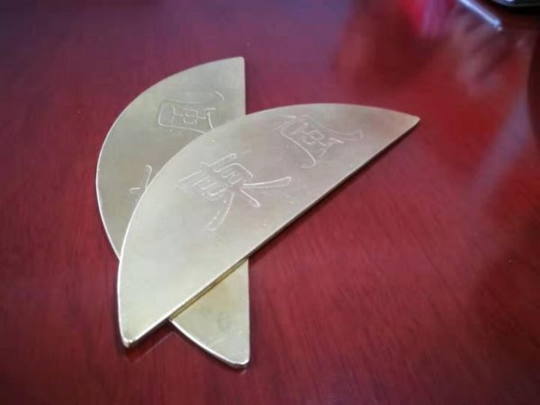 鸳鸯板是山东快书最常用的击节乐器,由两个月牙形的小铜片组成,表演时单手击节伴奏。