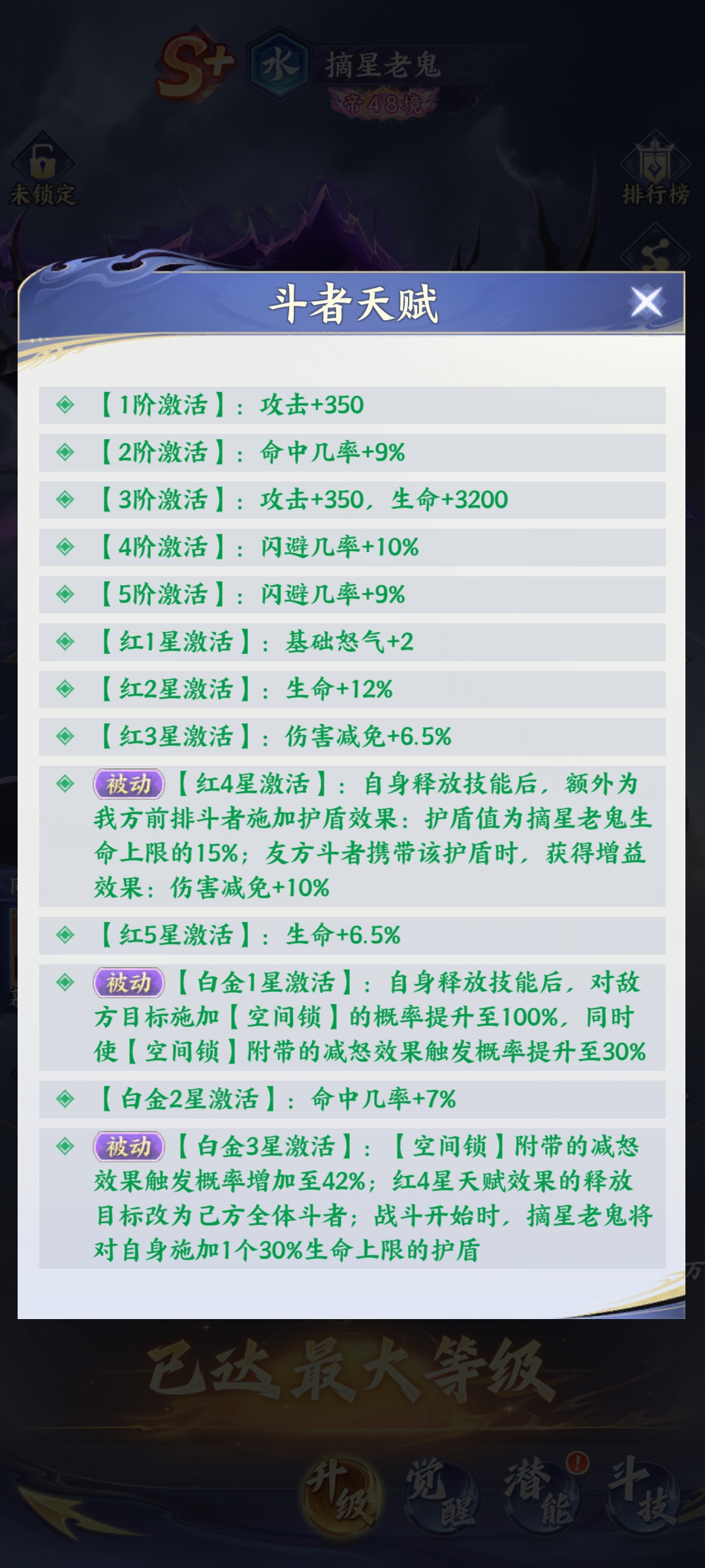星级养成是激活其多维潜能的关键路径。红四星阶段解锁首层质变:释放技能时,为前排斗者附加等同于其15%最大生命值的护盾,并额外提供100点固定伤害减免,大幅提升前排承伤稳定性。白金一星为首个核心突破节点,此时“空间锁”施加概率提升至100%,怒气削减触发率同步增至30%,彻底摆脱随机性依赖,实现稳定控场。抵达白金三星后,减怒概率进一步强化至40%,且护盾覆盖范围扩展至我方全体单位,战略价值全面升级。