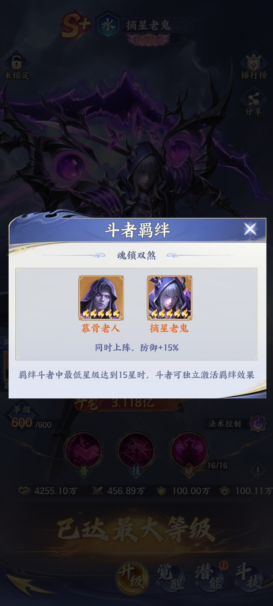 该角色的核心机制围绕“空间锁”展开:技能可对敌方全体造成90%基础伤害,并有60%概率施加持续两回合的“空间锁”减益效果。此状态将使目标在获取怒气时,额外承受20%概率的怒气削减(即实际获得怒气减半),从而有效延缓敌方大招释放节奏,实现从能量源头进行压制。此外,摘星老鬼与慕骨老人存在专属羁绊——两人同时登场时,全队防御力提升15%,显著增强阵容生存容错率。
