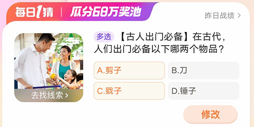 以上就是淘宝大赢家在古代人们出门必备以下哪两个物品答案了,本次大赢家问题是一个选项题,大家在选择本次问题的答案时,就只要选择A和C这两个选项即可,这两个选项就是本次问题的答案了,大家在回答问题时,就通过这两道答案去回答吧。