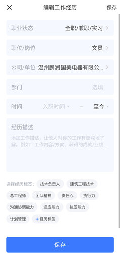 2、通过编辑和描述工作经历来完善自己的简历。