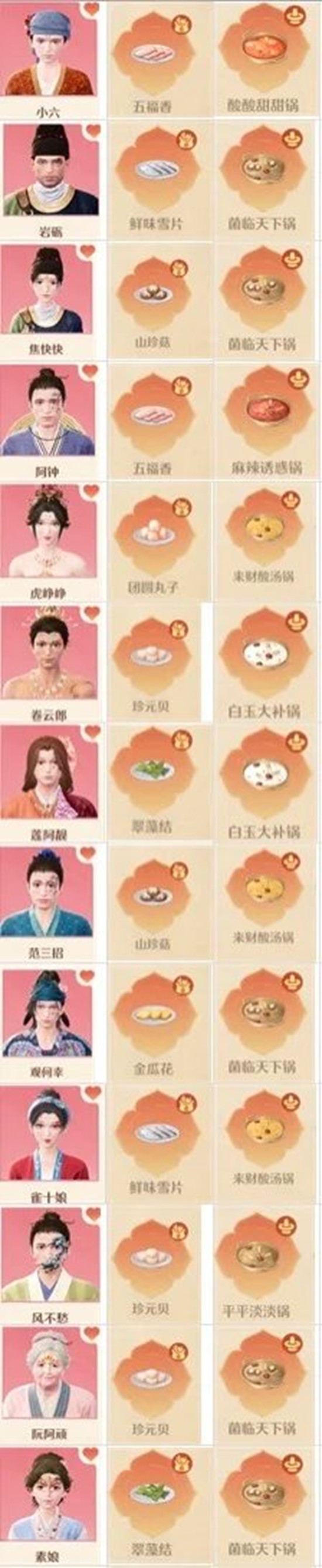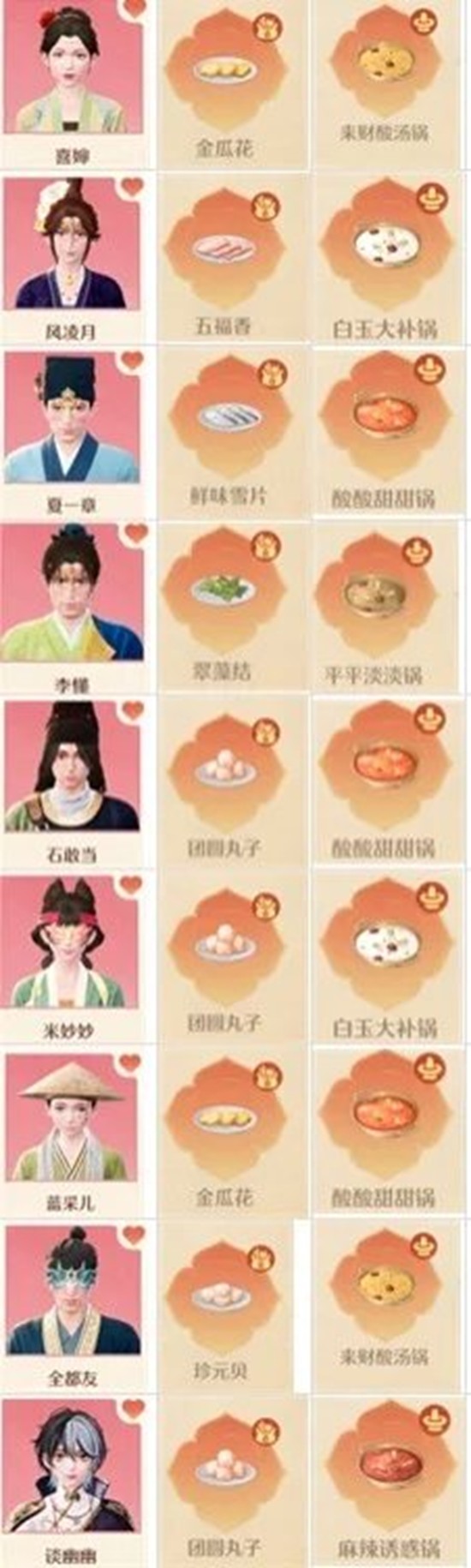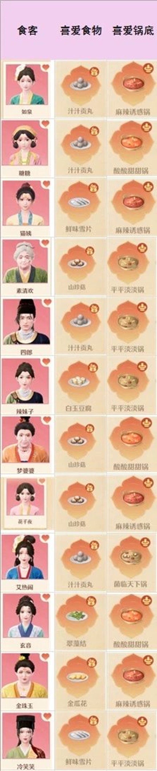 你对照表中他们喜爱的锅底食材来更换大概率就是喜爱这个菜的来惹,比如如泉喜欢汁汁贡丸,力荐里你就放贡丸,这样大概率她就会来!
