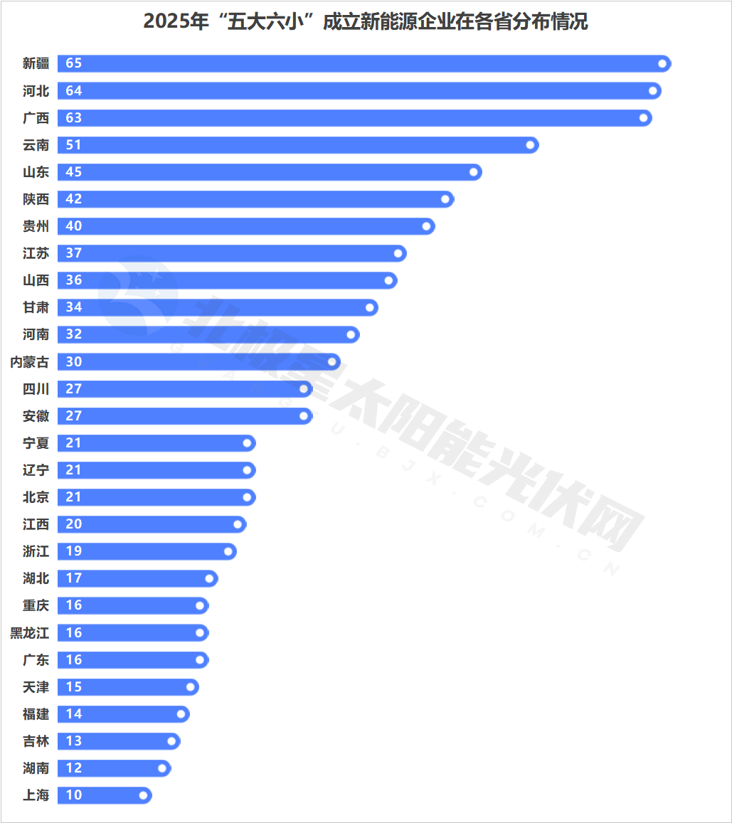 具体来看:国家电投持续强化在中西部的布局,2025年在新疆和甘肃新设企业超过40家;华能集团的投资重点从2024年的广西、河南,转向了云南和新疆;国家能源集团在稳固广西市场的同时,加大了对河北和甘肃的投入;华电集团则转向了陕西、河北和贵州等地。