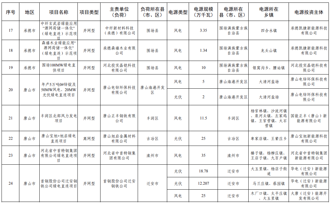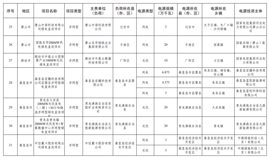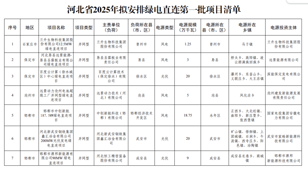 2025年12月17日,河北省发布2025年绿电直连拟安排第一批项目情况公示,共31个、427.752万千瓦。
