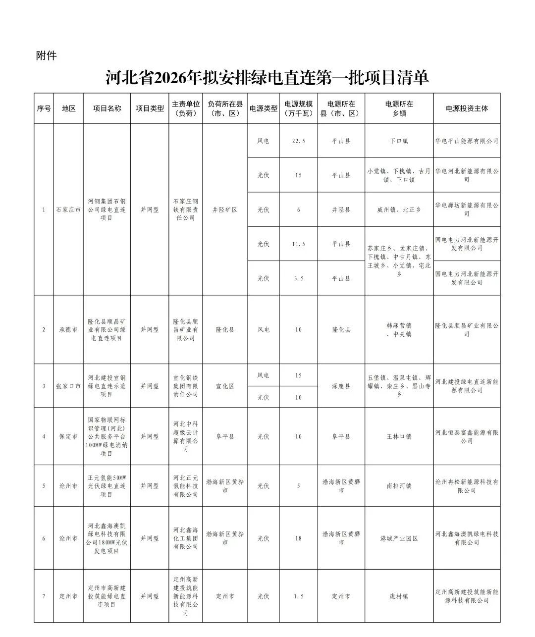 2026年2月6日,河北省后发布《河北省2026年绿电直连拟安排第一批项目情况公示》、《河北省2026年绿电直连拟安排第一批项目情况补充公示》。本次项目共8个,规模共计1.436GW,其中,光伏811.44MW,风电625MW。