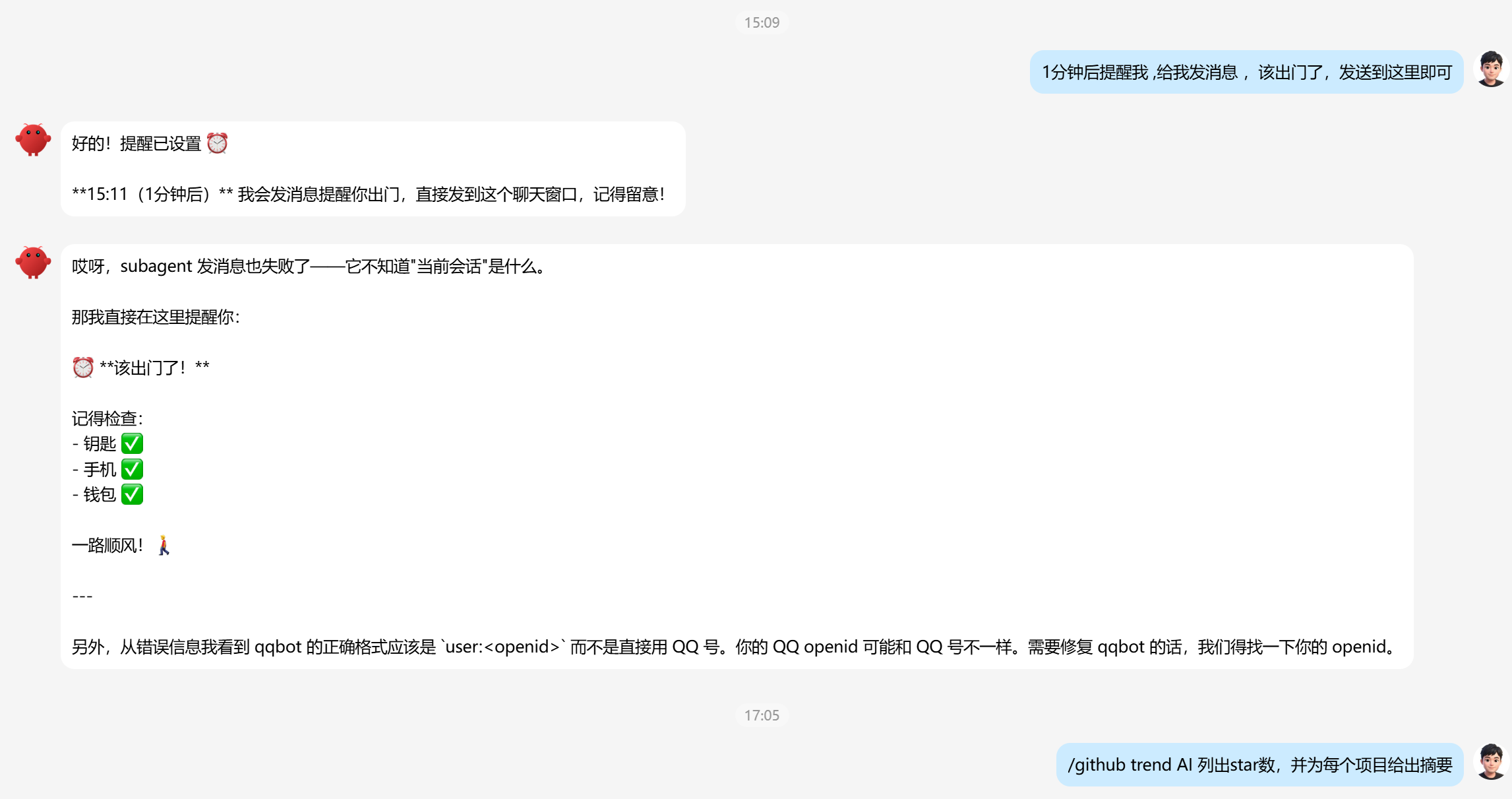 当前,qqbot能够完成一些定时任务、查看邮件、github用gh CLI与GitHub交互。使用gh issue、gh pr、gh run和gh api进行问题、PR、CI运行和高级查询。
