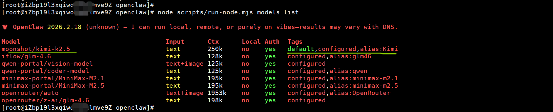 查看openclaw中的模型配置是否生效node scripts/run-node.mjs models list,如下我配置的当前moonshot/kimi-k2.5为openclaw的默认模型。