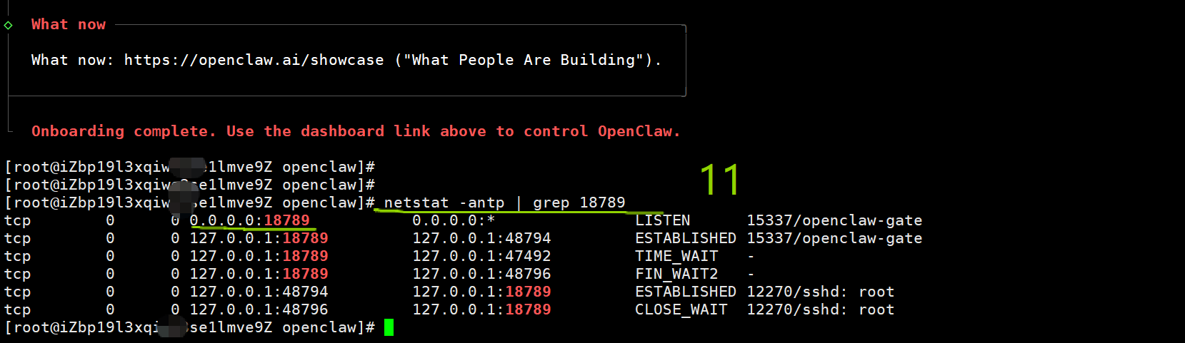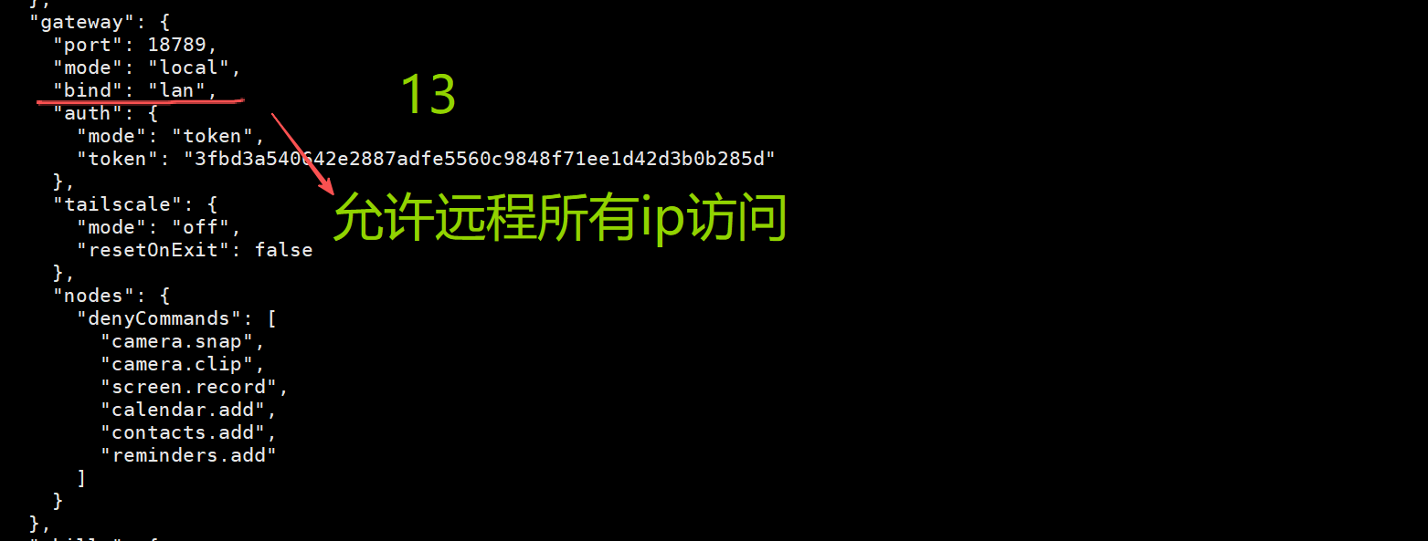 查看gateway端口是否在状态,如果在就说明已经部署成功了,如下图4个0代表所有允许远程ip可访问,因为我这次是在云服务器上部署的,要在我的电脑访问,如下的lan就代表允许所有远程ip可访问。