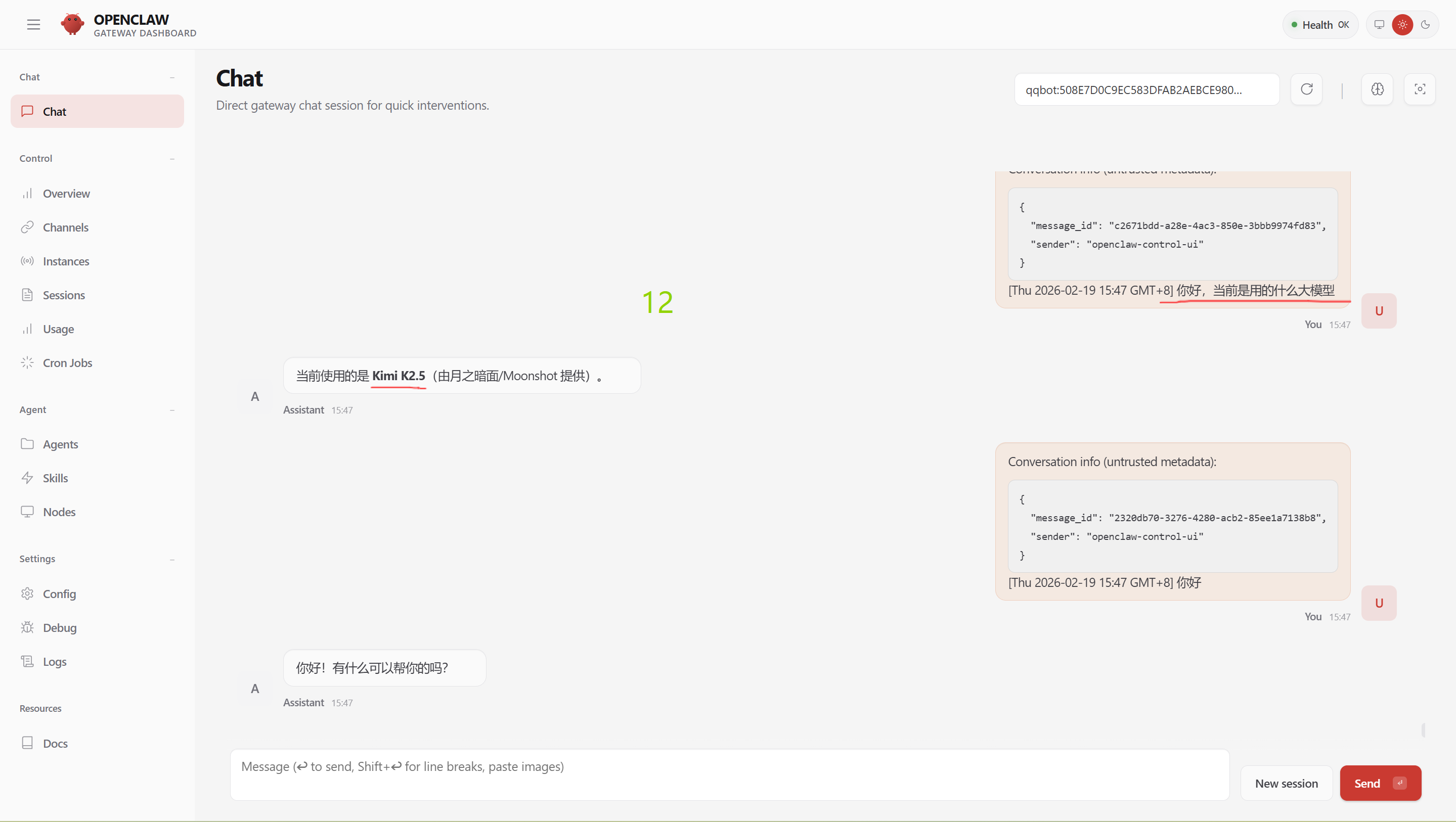 访问openclaw ch@t ,在对话ch@t中输入你好,或者你好,当前是用的什么大模型,如果能正确回复就代表正常了。