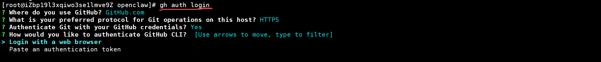 使用github这个skill时先在后台执行gh auth login,在浏览器链接,如下选择Login with web browser在浏览器中登录github后完成验证授权,即可使用github,去使用gh CLI与GitHub交互。使用gh issue、gh pr、gh run和gh api进行问题、PR、CI运行和高级查询。