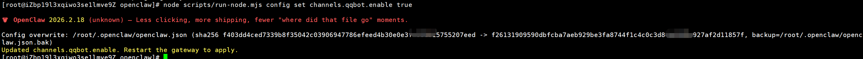 参考前文中的qqbot部署相关命令,在后台执行以下命令,添加openclaw-china/qqbot插件,这几条命令执行后去检查,看openclaw.json中是否有qqbot的配置,至此,完成qqbot部署。
