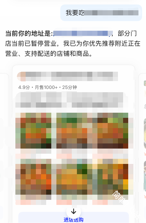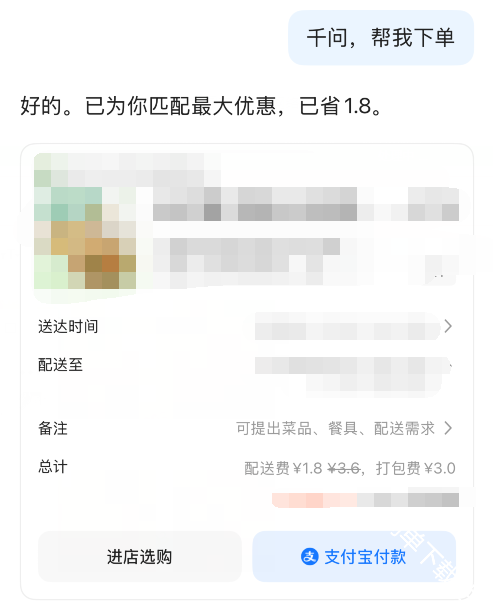 千问可直接通过发送信息来点外卖购物,可直接发送想要购买的物品详细内容,以此来缩小范围,找到自己想要购买的物品后就可以点击进店来购物选取了,还可在此进行修改备注地址等信息,最后点击支付宝付款即可。
