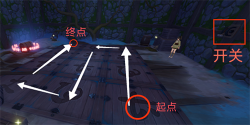 击杀完魔物与藤原俊子对话后,得到藤原俊子的宝图,然后跟随任务引导开启机关并进行解密。解密方式为按照一定顺序踩地面花纹。