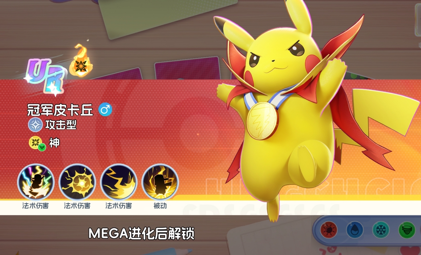 一旦完成MEGA进化,冠军皮卡丘就能立刻获得一个新技能,且在MEGA进化达到二阶时,该技能可让冠军皮卡丘的普攻附带麻痹效果,令它能更好地去利用麻痹特性叠层,让敌人陷入无法动弹的状态。待MEGA进化达到五阶时,冠军皮卡丘还会在首次濒死时进入无敌状态,并对所有敌人进行附带三层麻痹效果的持续电击,随后又能回满全部血量继续输出。因此,非常建议各位将它培养至MEGA进化五阶,这会令冠军皮卡丘的强度产生质变。