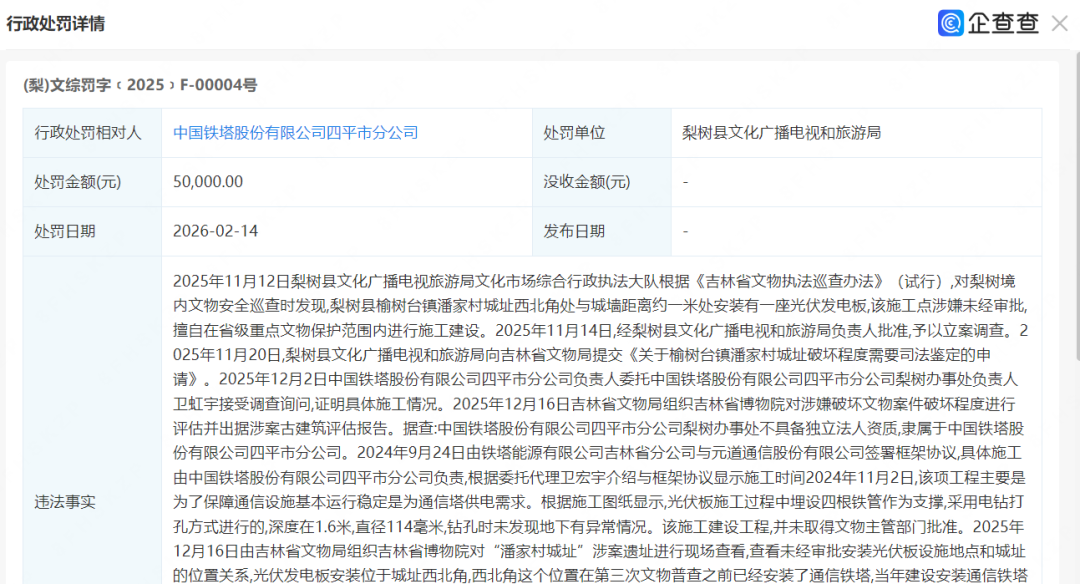 近日,吉林省梨树县文化广播电视和旅游局对中国铁塔股份有限公司四平市分公司作出行政处罚,罚款r民币5万元,原因是该公司未经审批擅自在省级文物保护单位“潘家村城址”范围内安装光伏发电板。