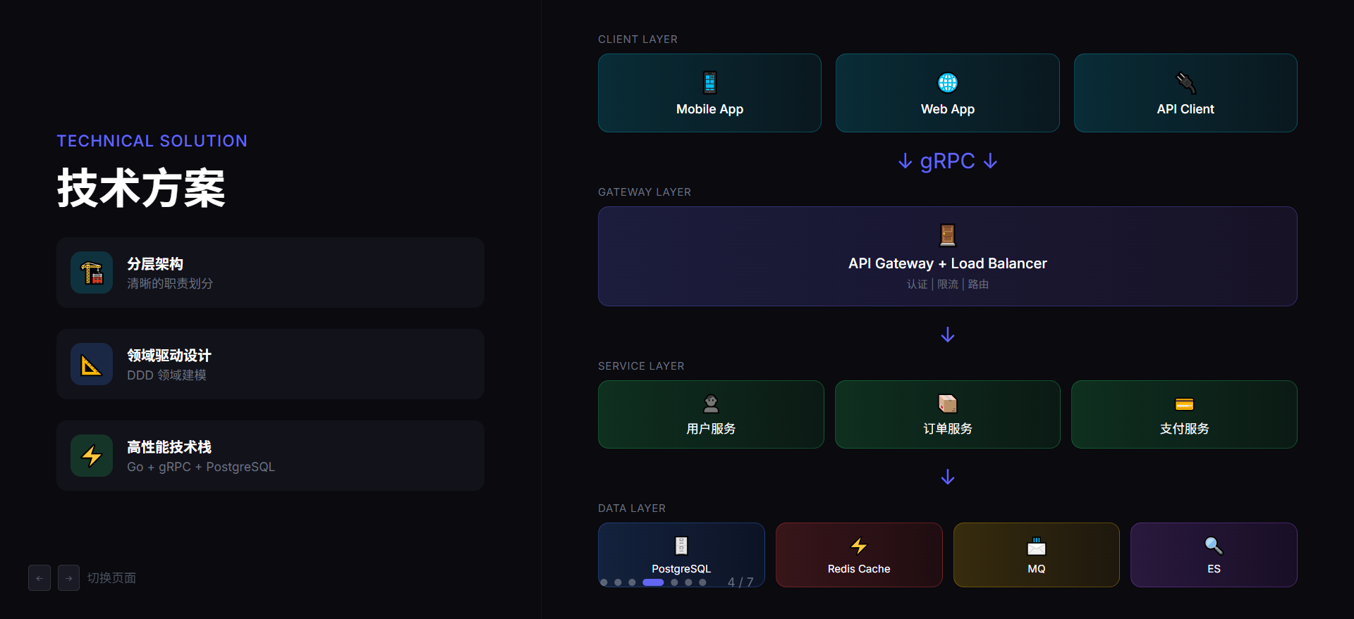 帮我生成一份技术方案演示稿的HTML代码,样式整体使用Tailwind CSS。
