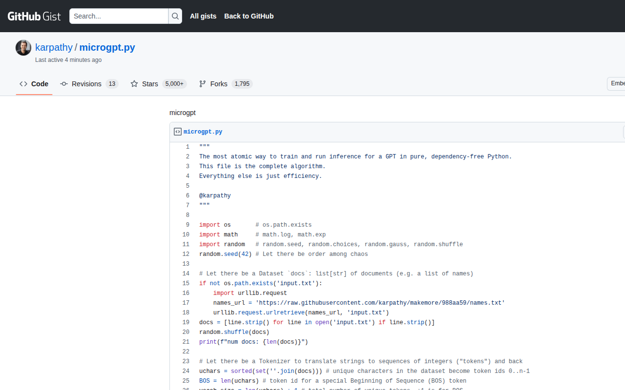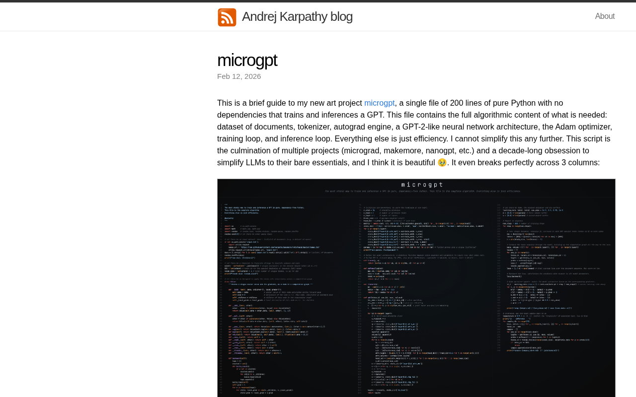 2026 年 2 月,Karpathy 发布了 microgpt —— 200 行纯 Python、零依赖的 GPT 实现。