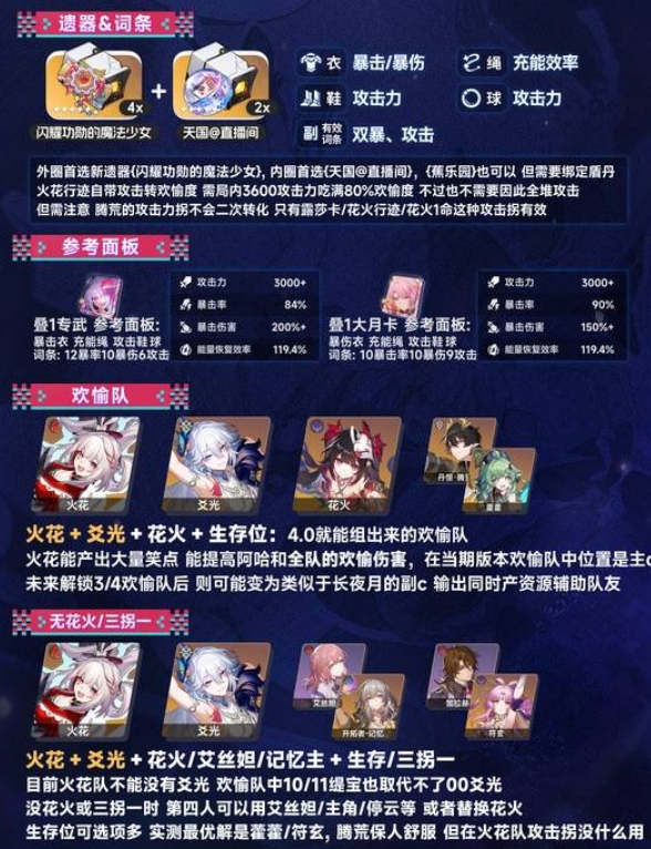 1、腾荒的攻击拐不会被火花二次转换成欢愉度,火花吃满行迹80%需要3600攻击 如果0命花火+全队只带1套沉陆的情况下 需要局外攻击面板3000+,如果有花火1魂 则局外2600左右即可。