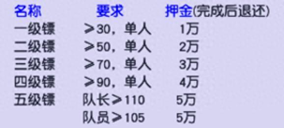 各等级镖银领取要求及完成后退还的押金如图所示: