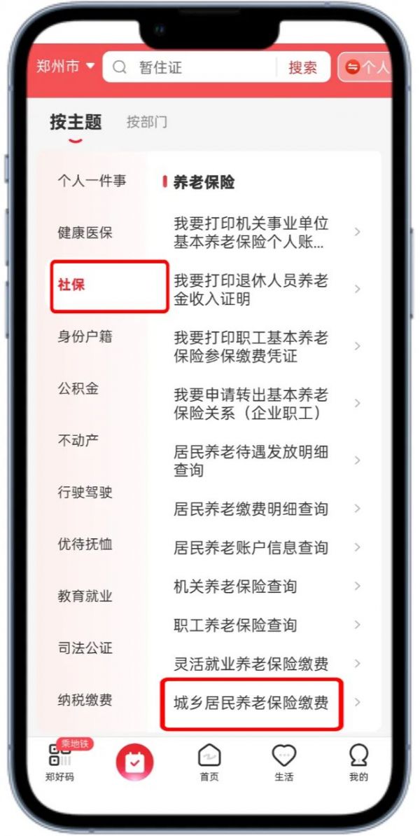 打开“郑好办”APP-点击“办事”-点击“社保”-点击“城乡居民养老保险缴费”,即可进入缴费页面。
