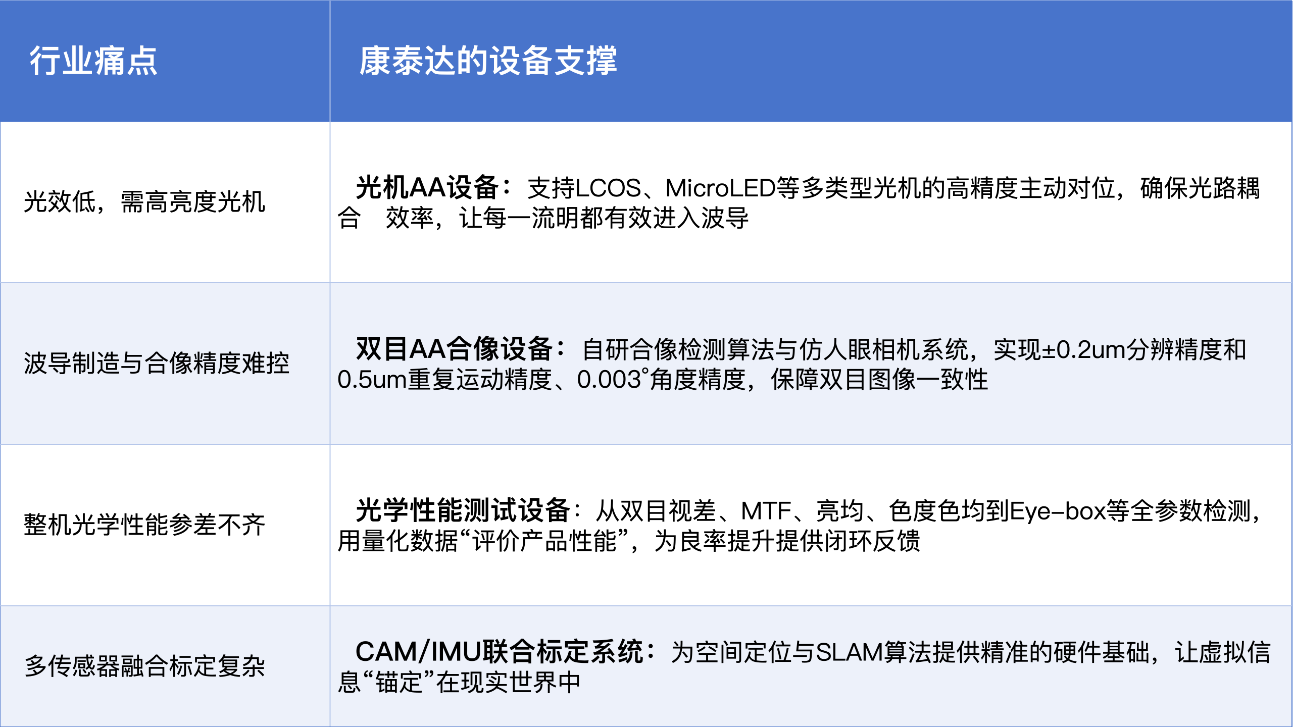 面对这些行业瓶颈,康泰达的角色不是“解决光学原理”,而是“用精密装备让好技术造出来好产品”。 我们聚焦XR智能装备十多年,核心能力在于:用自研算法与高精度运动控制,帮客户把“设计精度”转化为“量产良率”。 针对上述痛点,我们的设备方案对应解决: