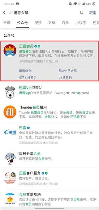 第一步:打开微信搜索功能,输入"迅雷会员"官方公众号进行查找;