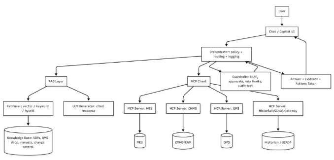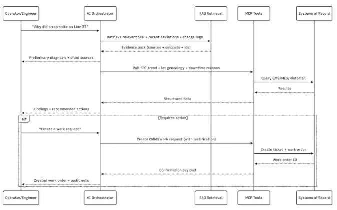 RAG 检索已审批的配方限值、质量约束与安全联锁备注,MCP向对应系统提交变更申请(非直接变更)、附佐证材料、流转审批并记录理由以备审计。这个例子也体现了制造业与普通消费级AI的一个关键区别:最优设计通常是人在回路 + 安全约束,而非完全自主。