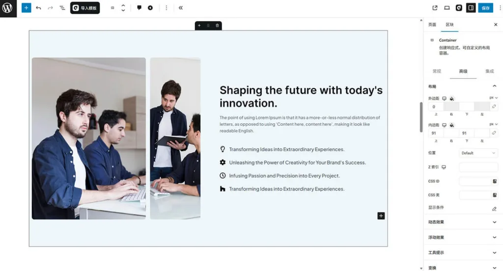 - 精细的自定义控制:提供对每个区块的深度定制能力,从间距、排版、颜色到动画效果,均可进行像素级调节,精准实现您的设计构想。