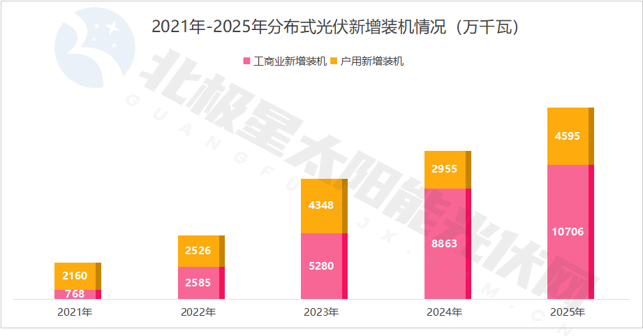 国家能源局最新数据显示,2025年分布式光伏成绩单堪称亮眼。相比2024年的11818万千瓦,2025年整体装机增长了近3500万千瓦。特别是工商业光伏一举突破1亿千瓦大关。
