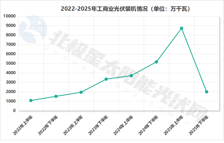 然而,这一增长大部分来自上半年的爆发式增长。进入下半年,市场急转直下,分布式新增装机锐减至4019.3万千瓦,环比暴跌64.4%。工商业光伏下半年仅新增1987.6万千瓦,对比上半年8718万千瓦暴跌77.2%。
