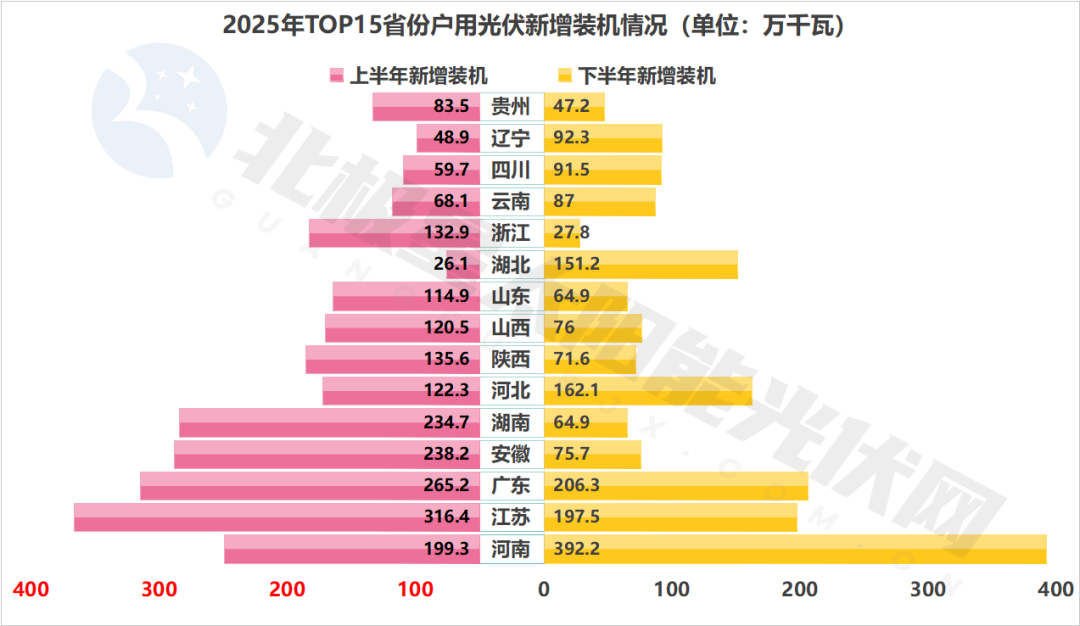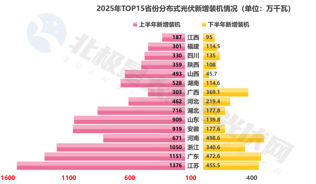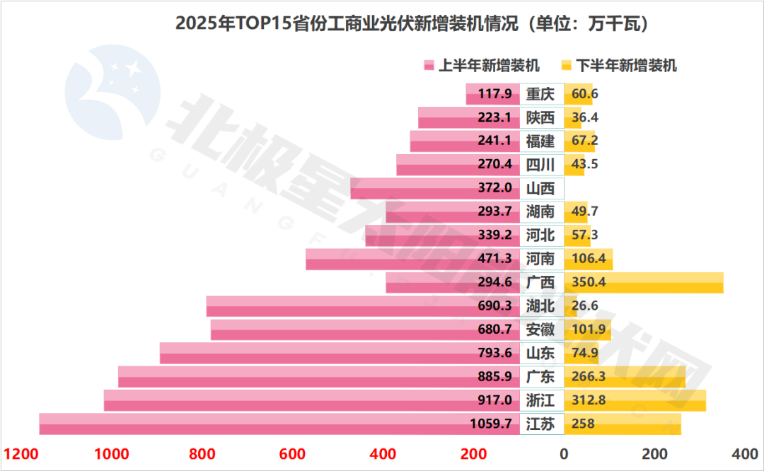 值得关注的是,个别省份呈现出“逆势增长”的亮点。在普遍低迷的工商业市场中,广西下半年工商业光伏新增装机达350万千瓦,跃居全国首位,甚至超越上半年水平。