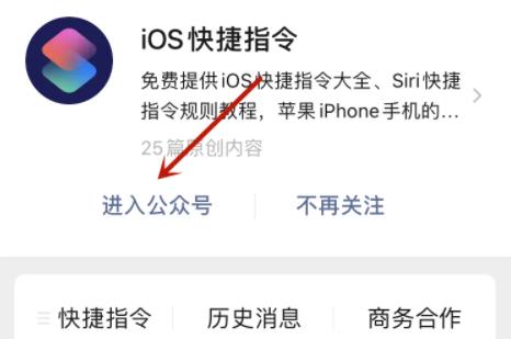 3、然后点击ios快截指令,再点击“进入公众号”。