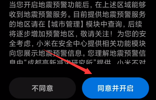 5、最后选择“同意并开启”就可以收到地震预警了。