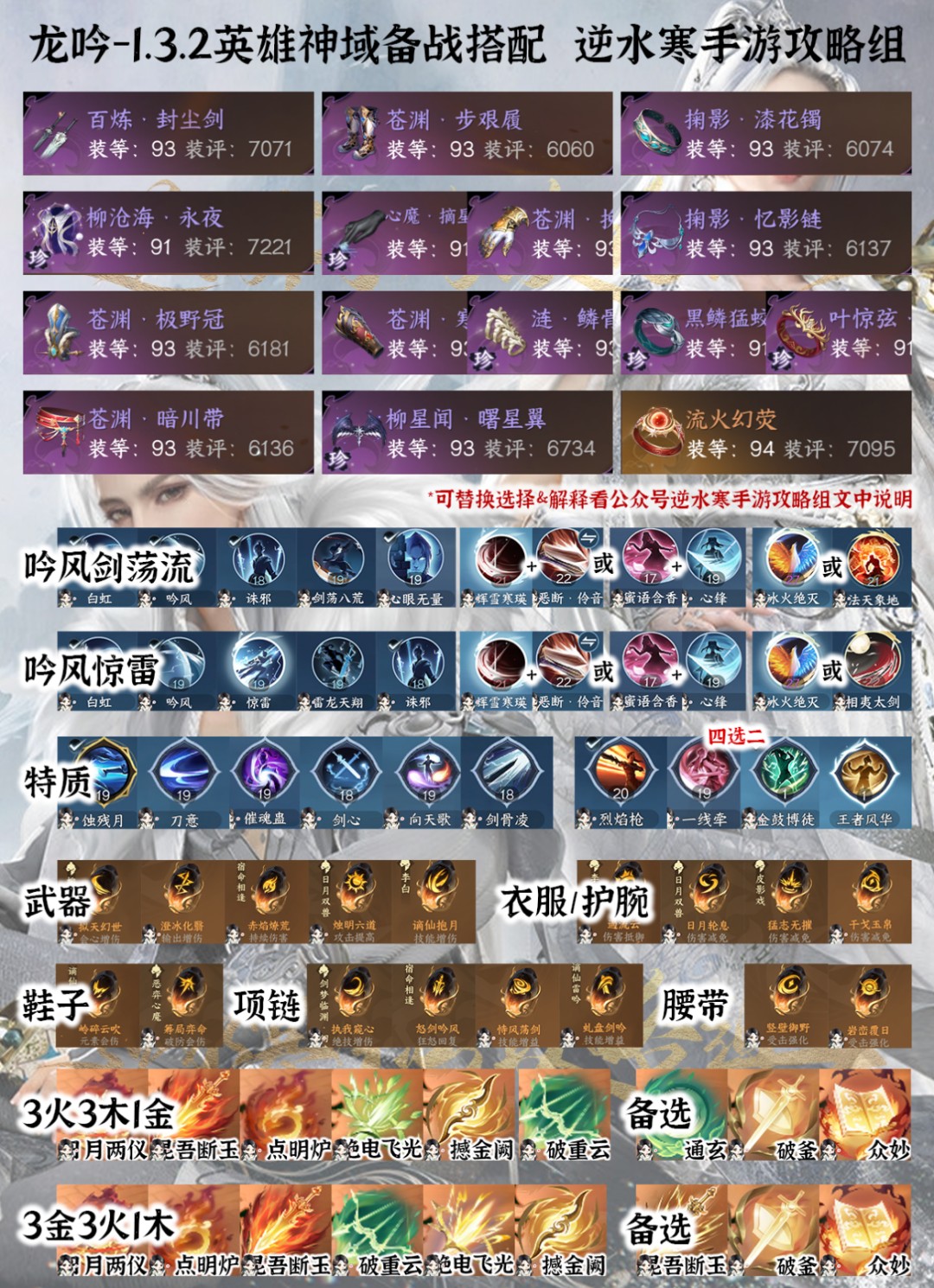 装备:英雄本要求的命中和会心增加的不多,随着大家面板和秒伤的提升,本内现在一般选择防具百炼四件套,独珍部位选择三连星手套。追求秒伤上限的玩家带鳞骨护腕,但需要面板破防3200左右(攻击首克越高,破防要求越低),副本内因各种攻击首克的加成,一般秒伤会比打木桩高1.5W-2W,龙吟职业进本可以多考虑鳞骨护腕+破防戒。下周可以做出新橙戒,就不推荐旧橙戒了。